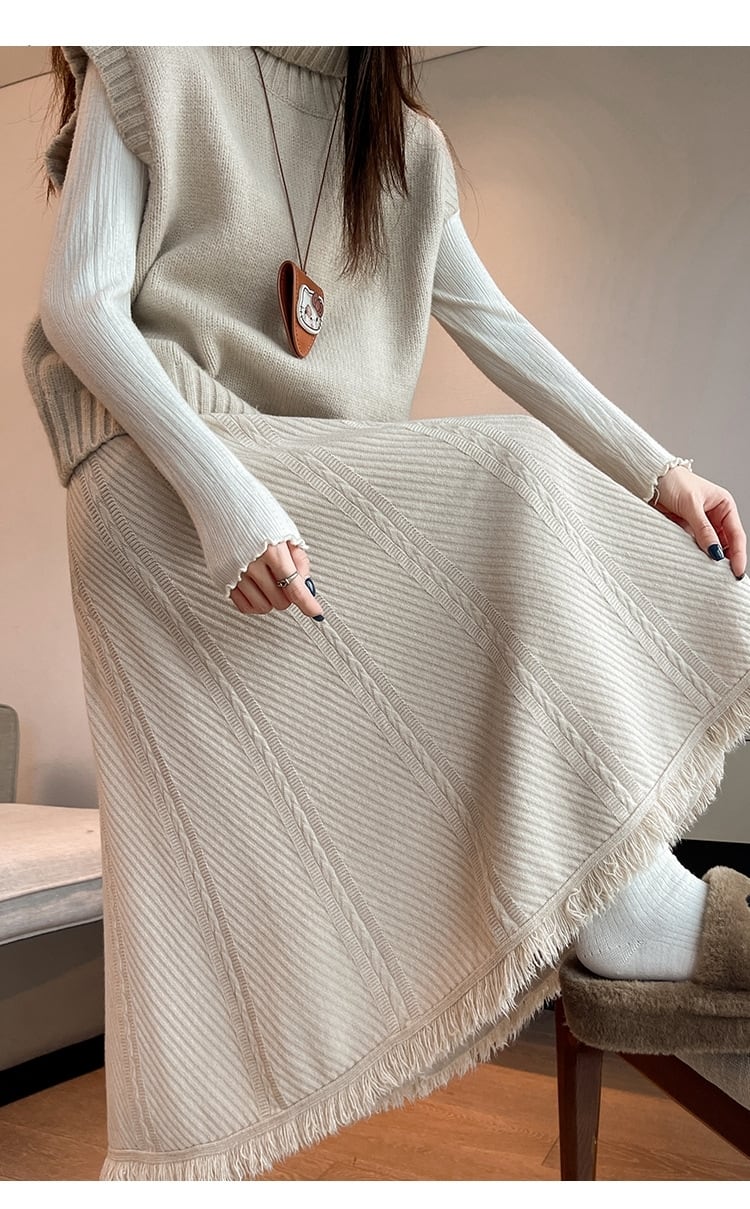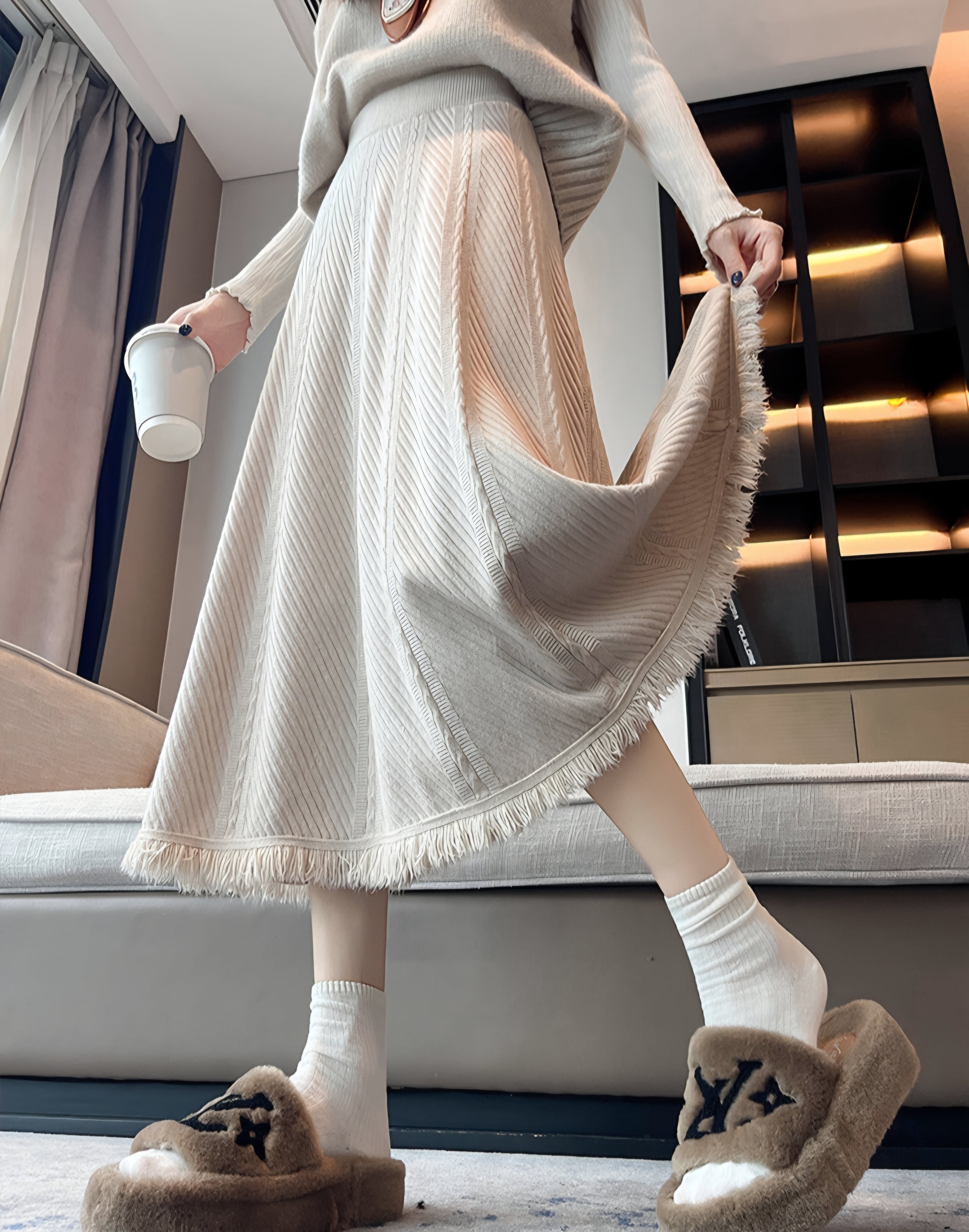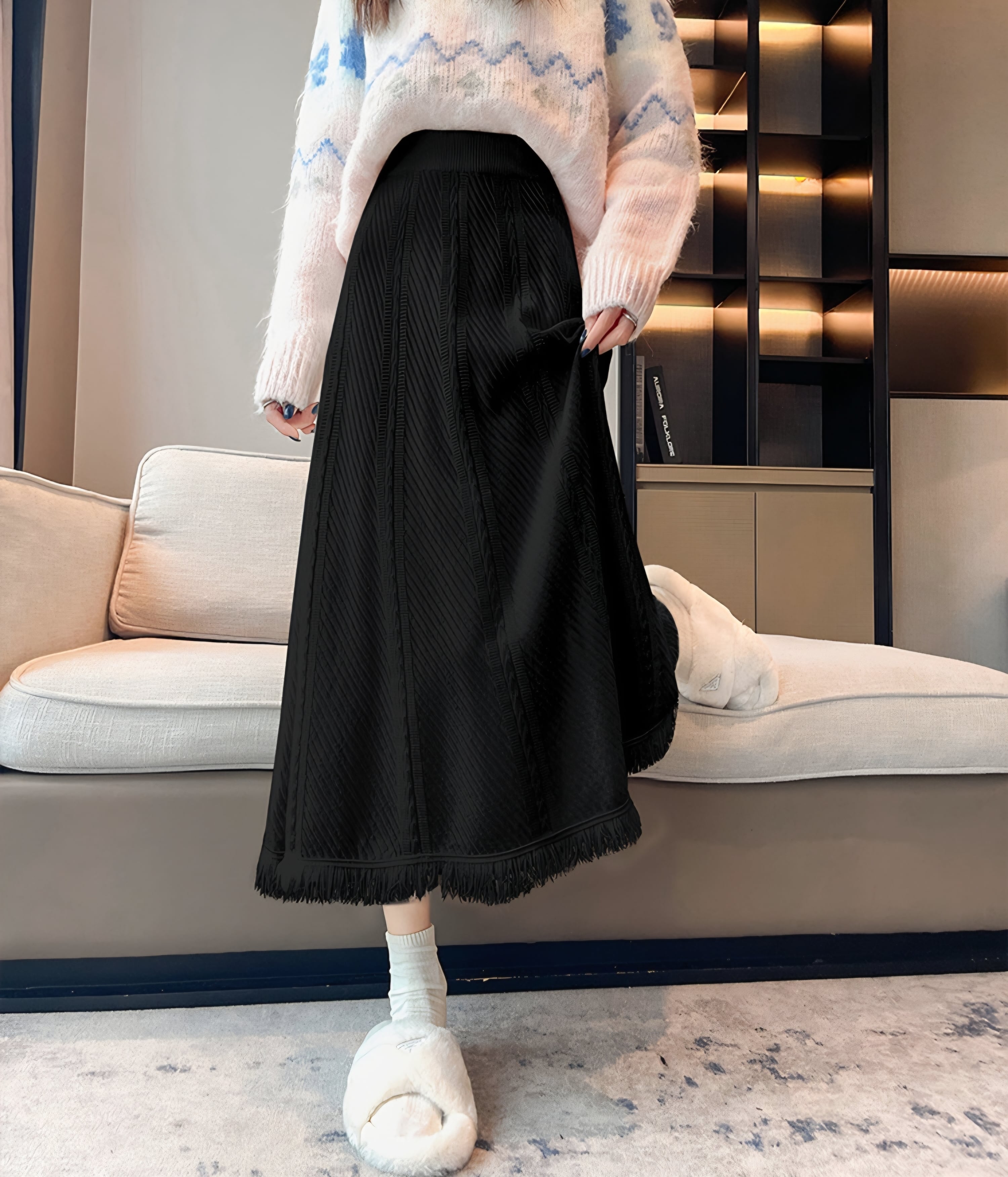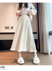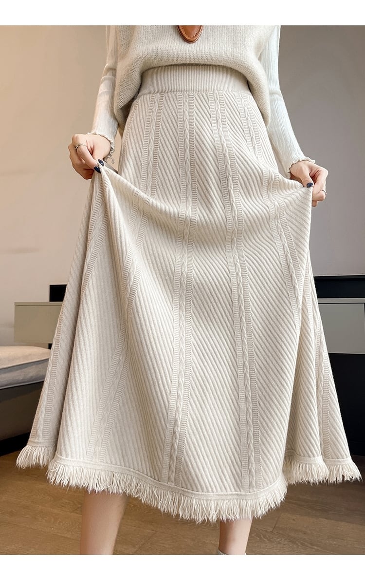 <ケーブル編みで立体的なデザインによる自然な脚長効果♡歩く度にフリンジが揺れて上品でフェミニンな女性を演出♡Aラインのスカートでどんな体型の方でも優しいデザインのスカート♡ニット素材がかわいい お出かけにも日常的にも使いやすい可愛いスカートです♡>