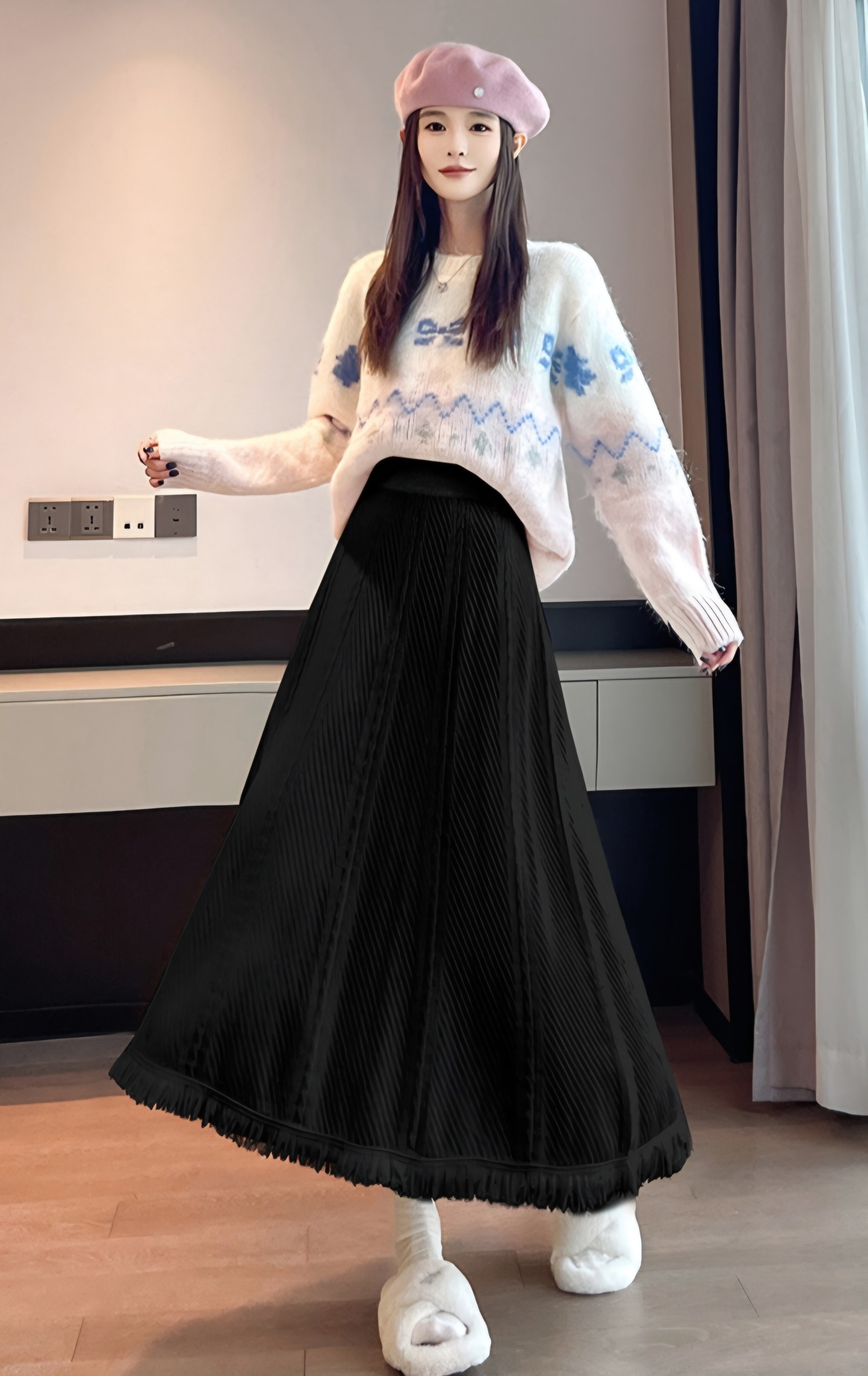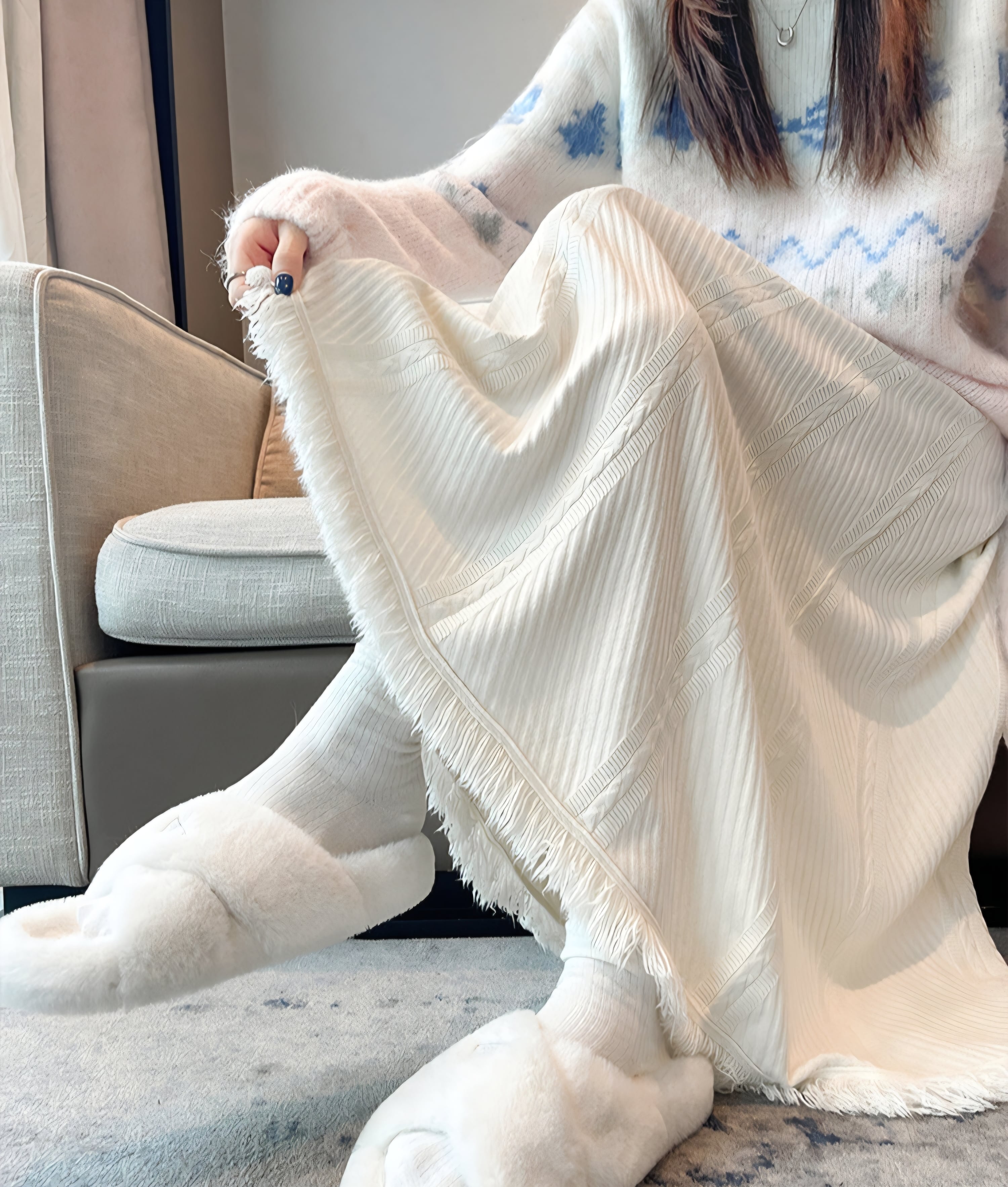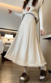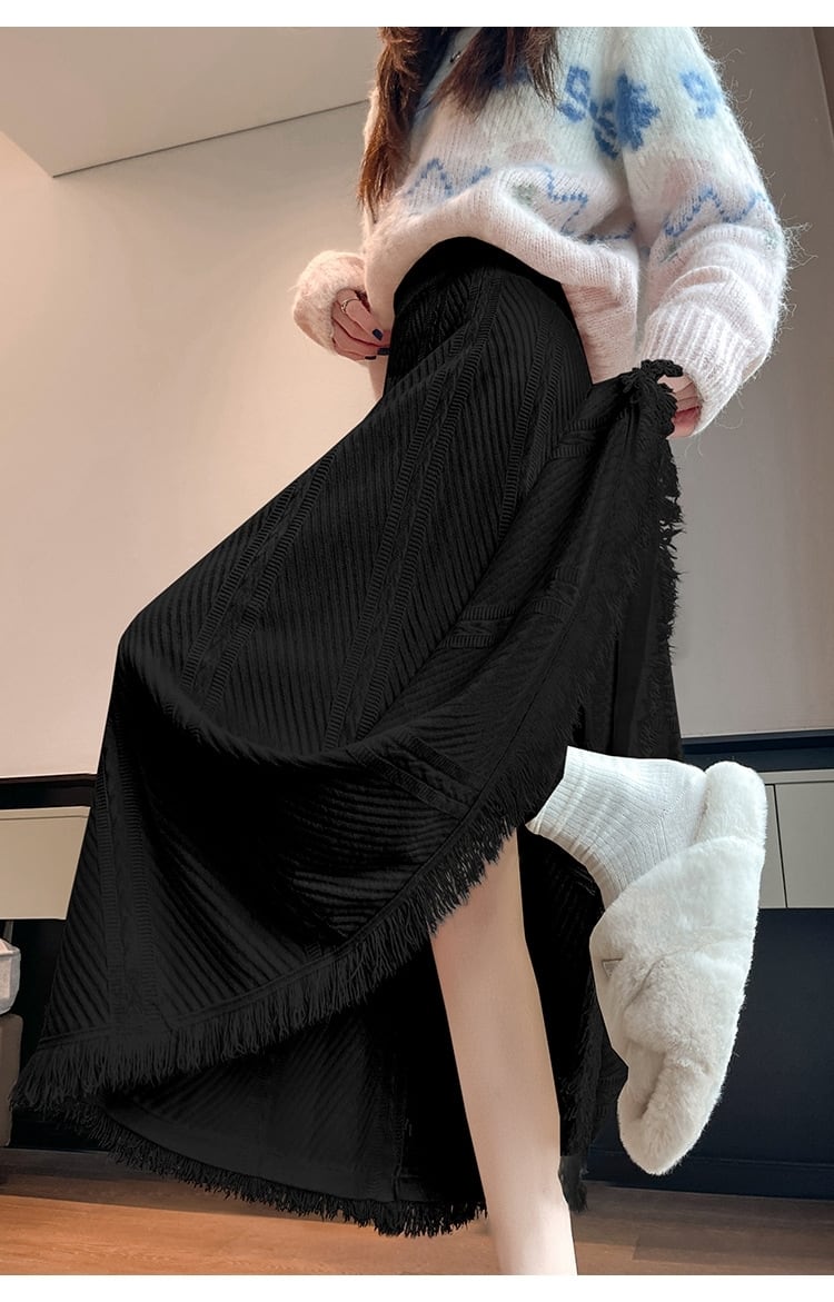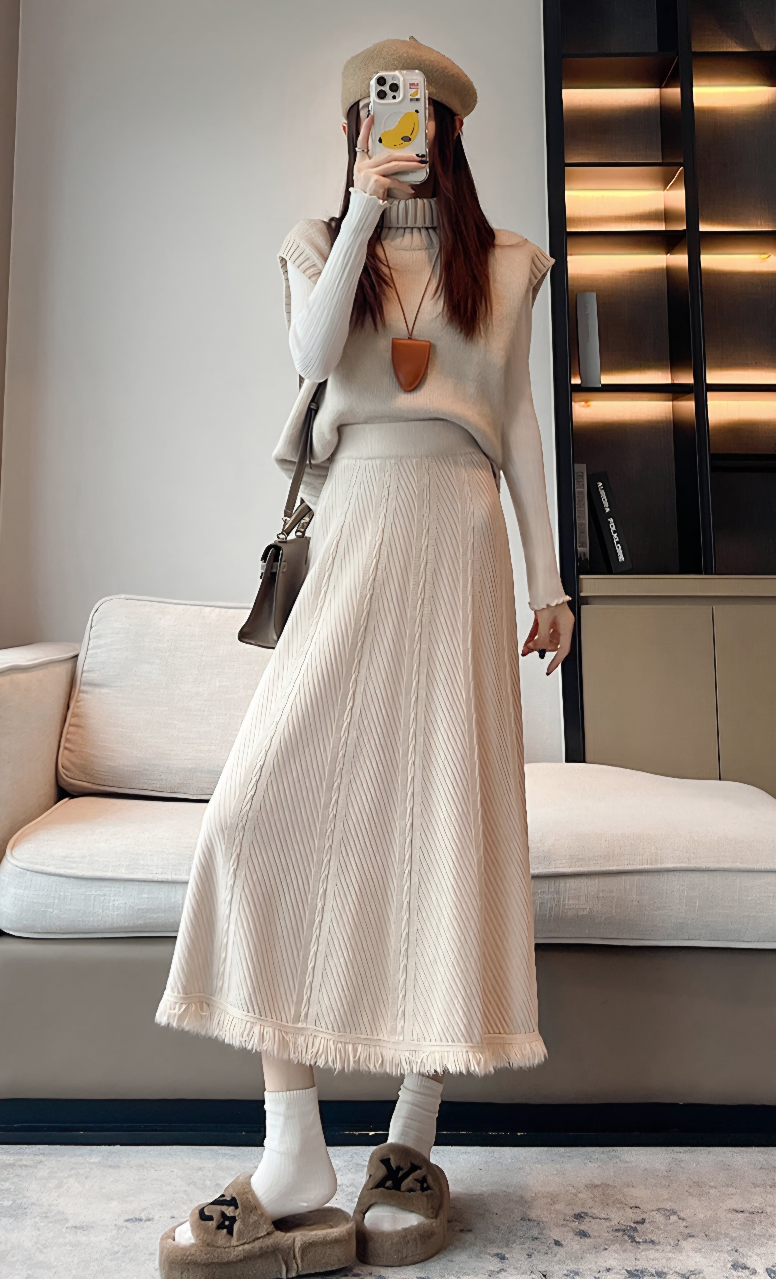 <ケーブル編みで立体的なデザインによる自然な脚長効果♡歩く度にフリンジが揺れて上品でフェミニンな女性を演出♡Aラインのスカートでどんな体型の方でも優しいデザインのスカート♡ニット素材がかわいい お出かけにも日常的にも使いやすい可愛いスカートです♡>