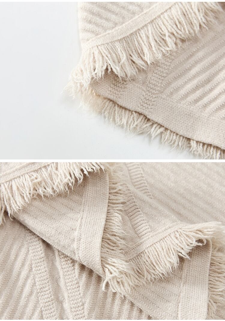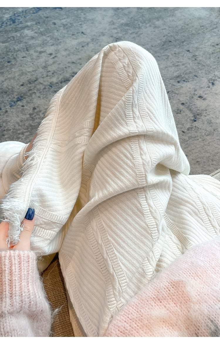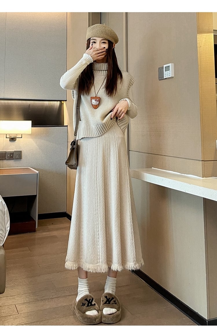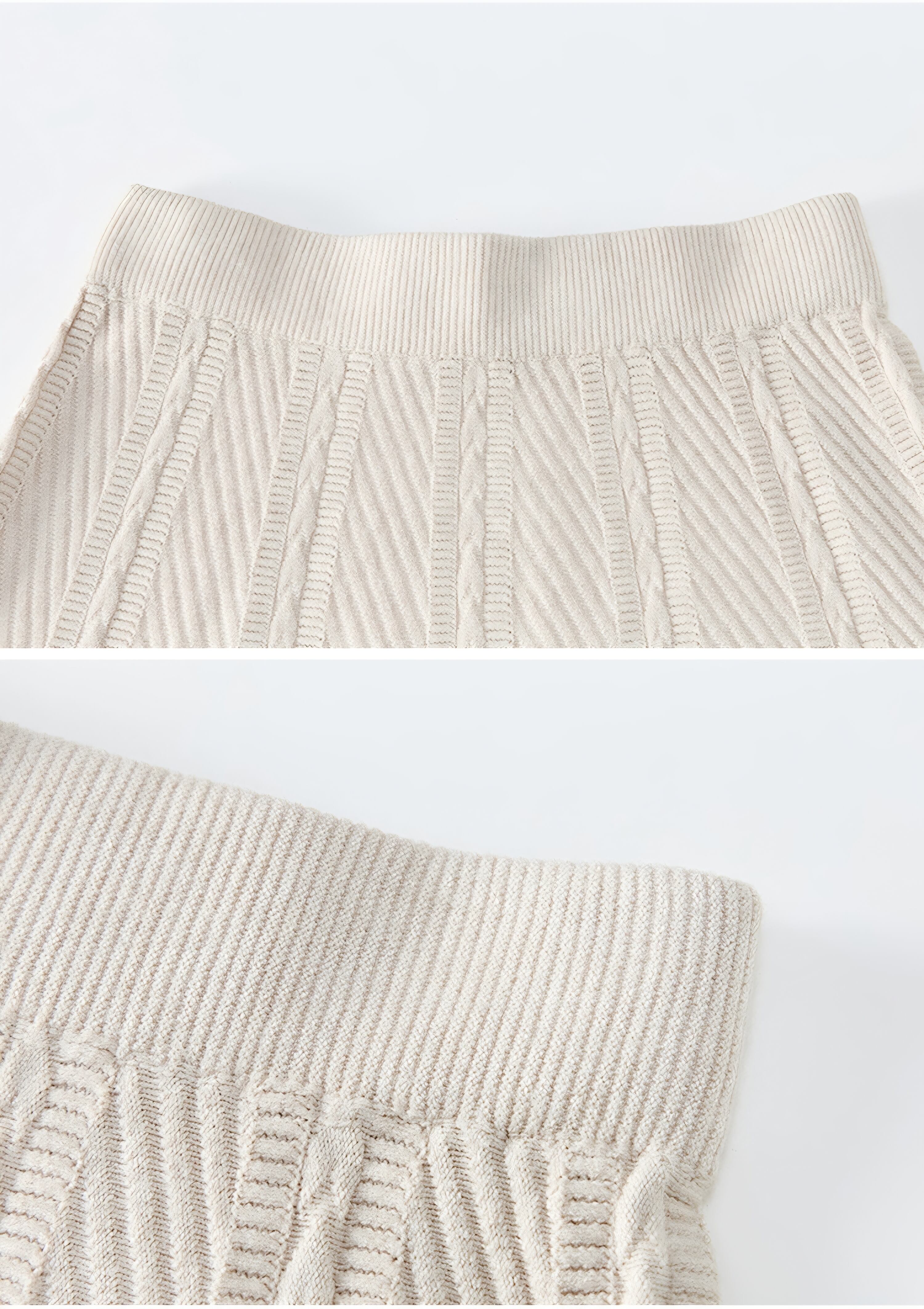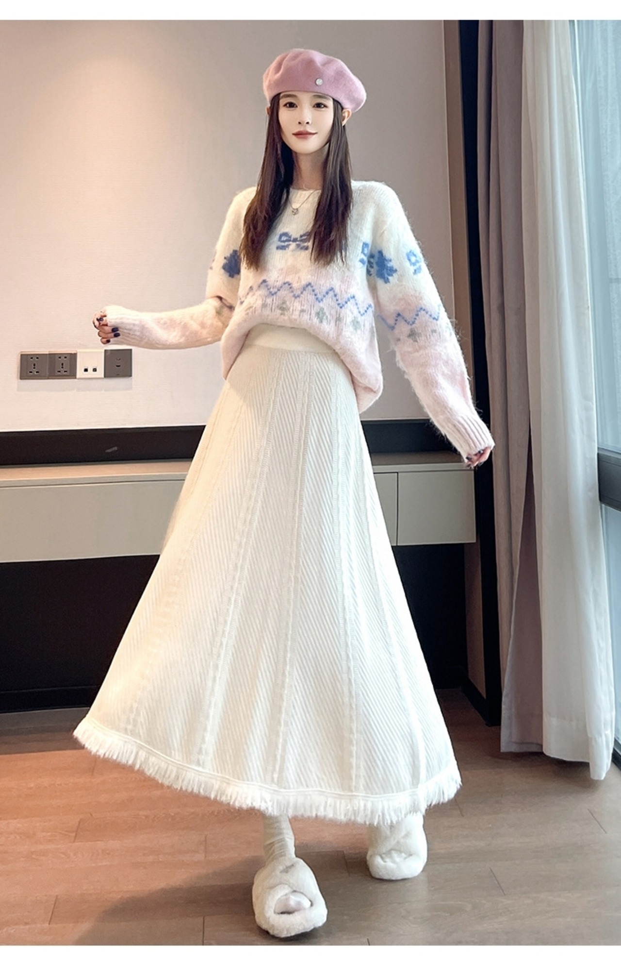 <ケーブル編みで立体的なデザインによる自然な脚長効果♡歩く度にフリンジが揺れて上品でフェミニンな女性を演出♡Aラインのスカートでどんな体型の方でも優しいデザインのスカート♡ニット素材がかわいい お出かけにも日常的にも使いやすい可愛いスカートです♡>