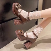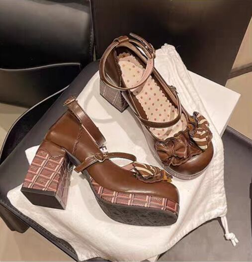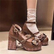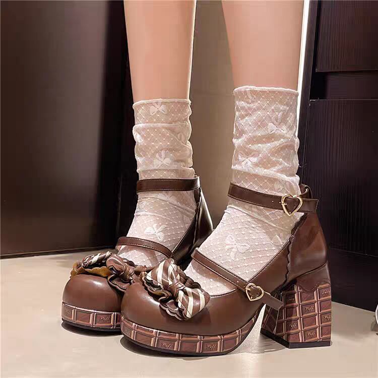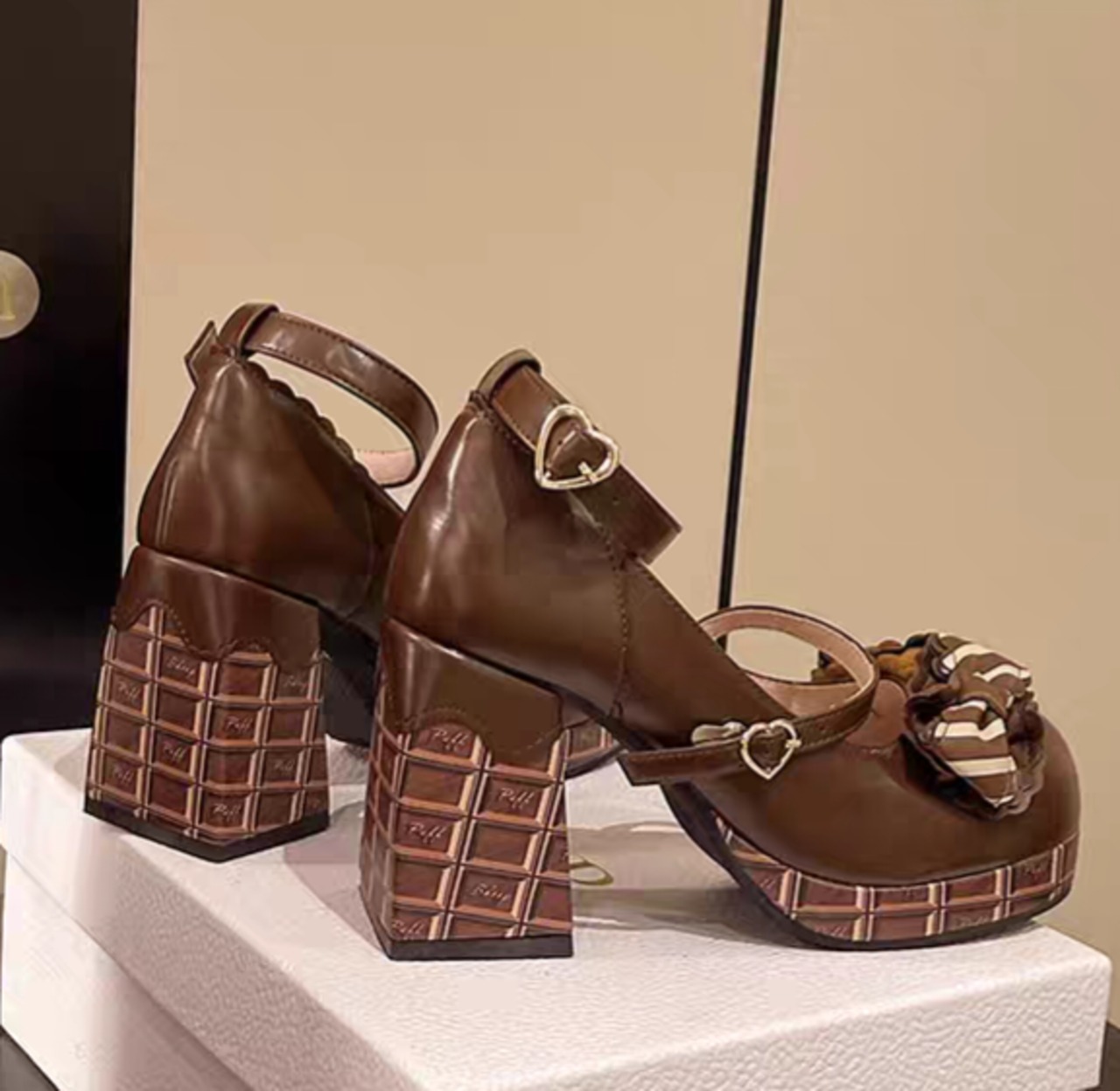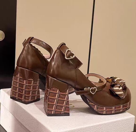 <ヒールやソール部分のチョコデザが見てるだけで可愛いローファー♡甘々なローファーだけどつま先のストライプリボンで遊び心も忘れない♡安定感のある太いヒールで歩きやすさもスタイルも抜群♡>
