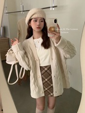 <立体的なケーブル編みとオーバーサイズで上品でかわいいカーディガン♡ゆったりとした着心地で体型カバーも抜群♡どのカラーもボトムスを選ばないから、コーデの幅が広がる万能カーディガン♡>
