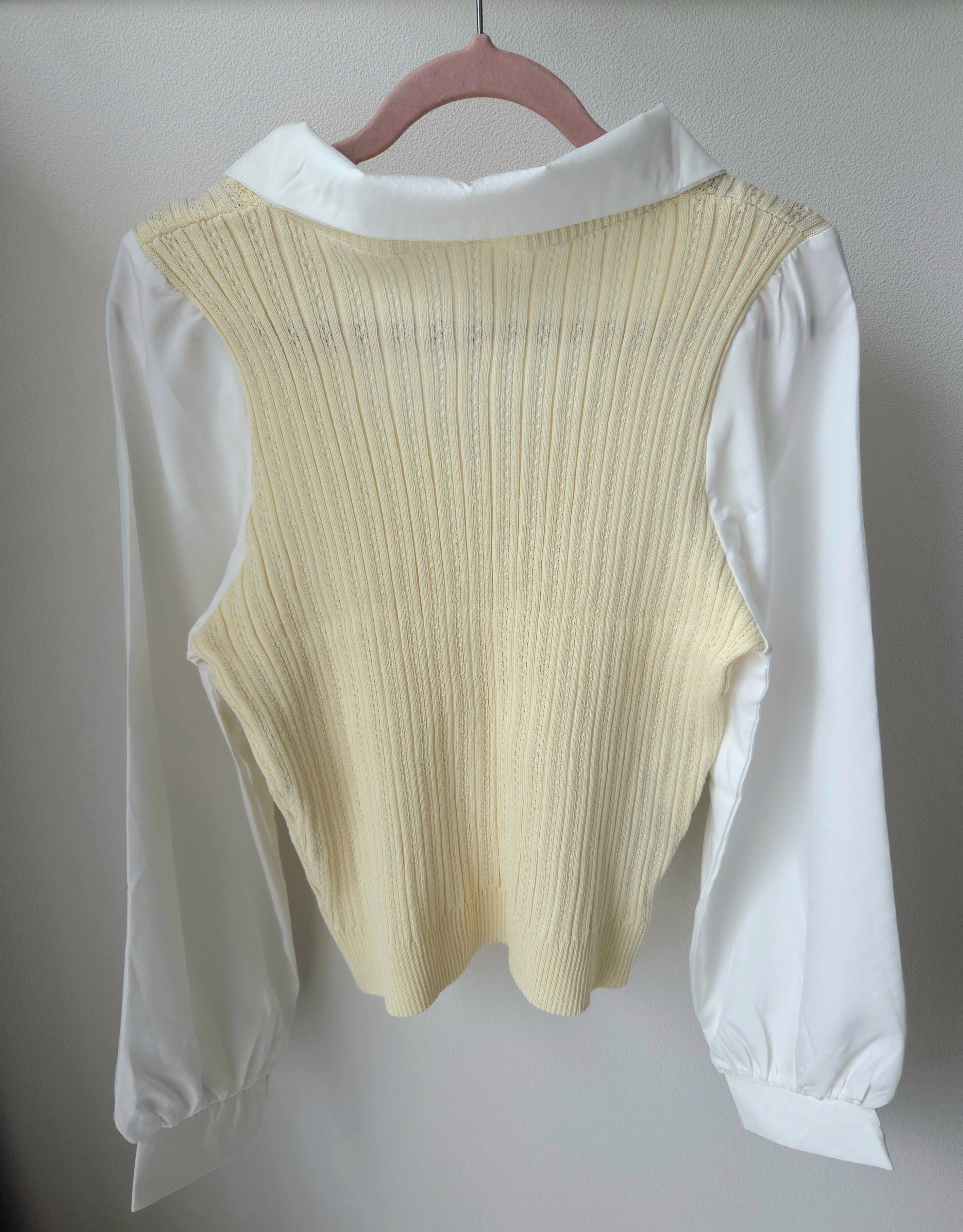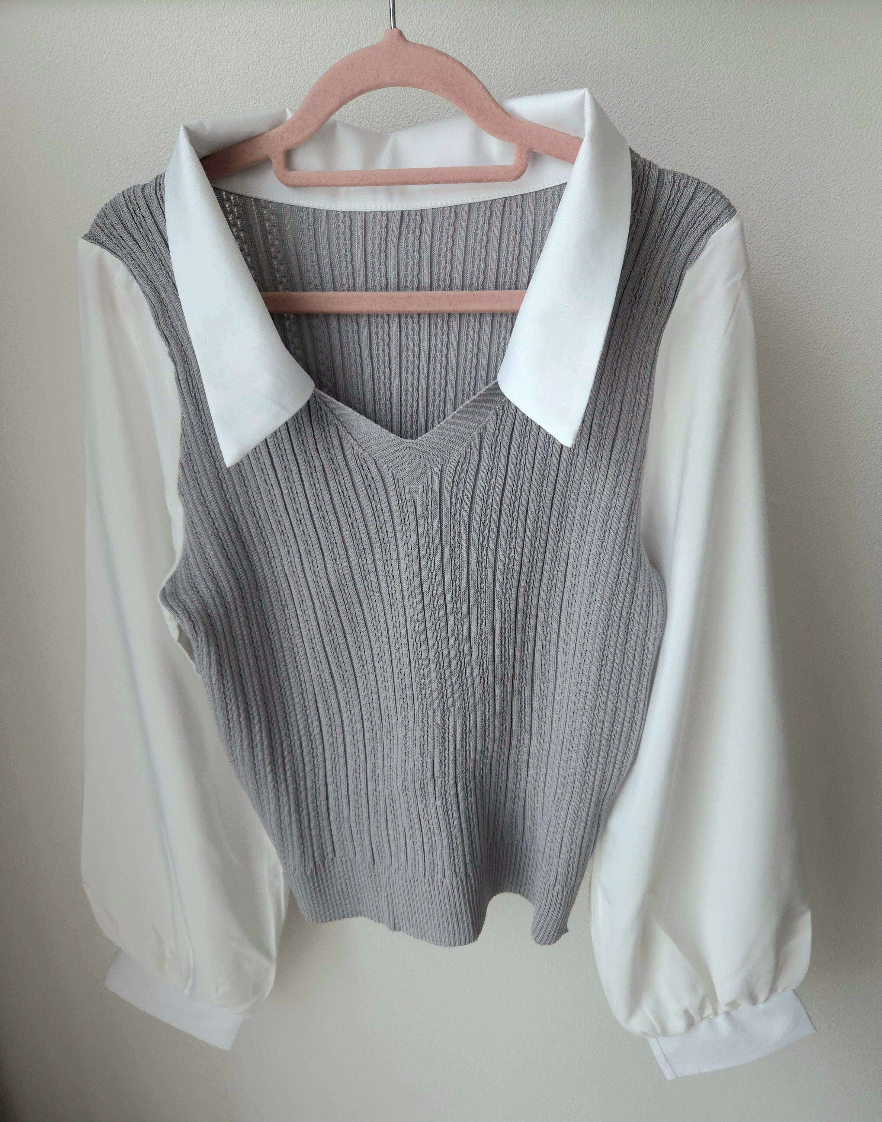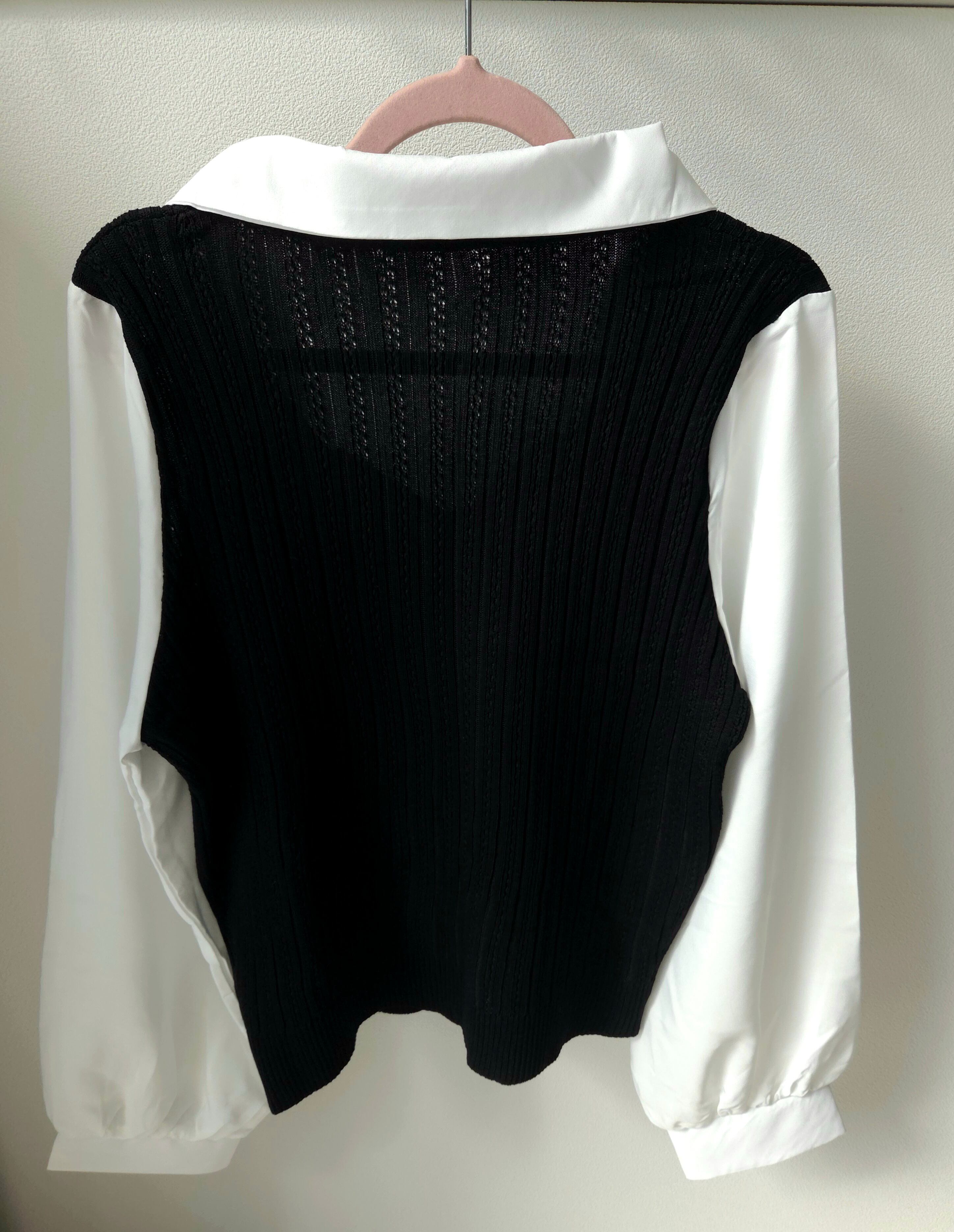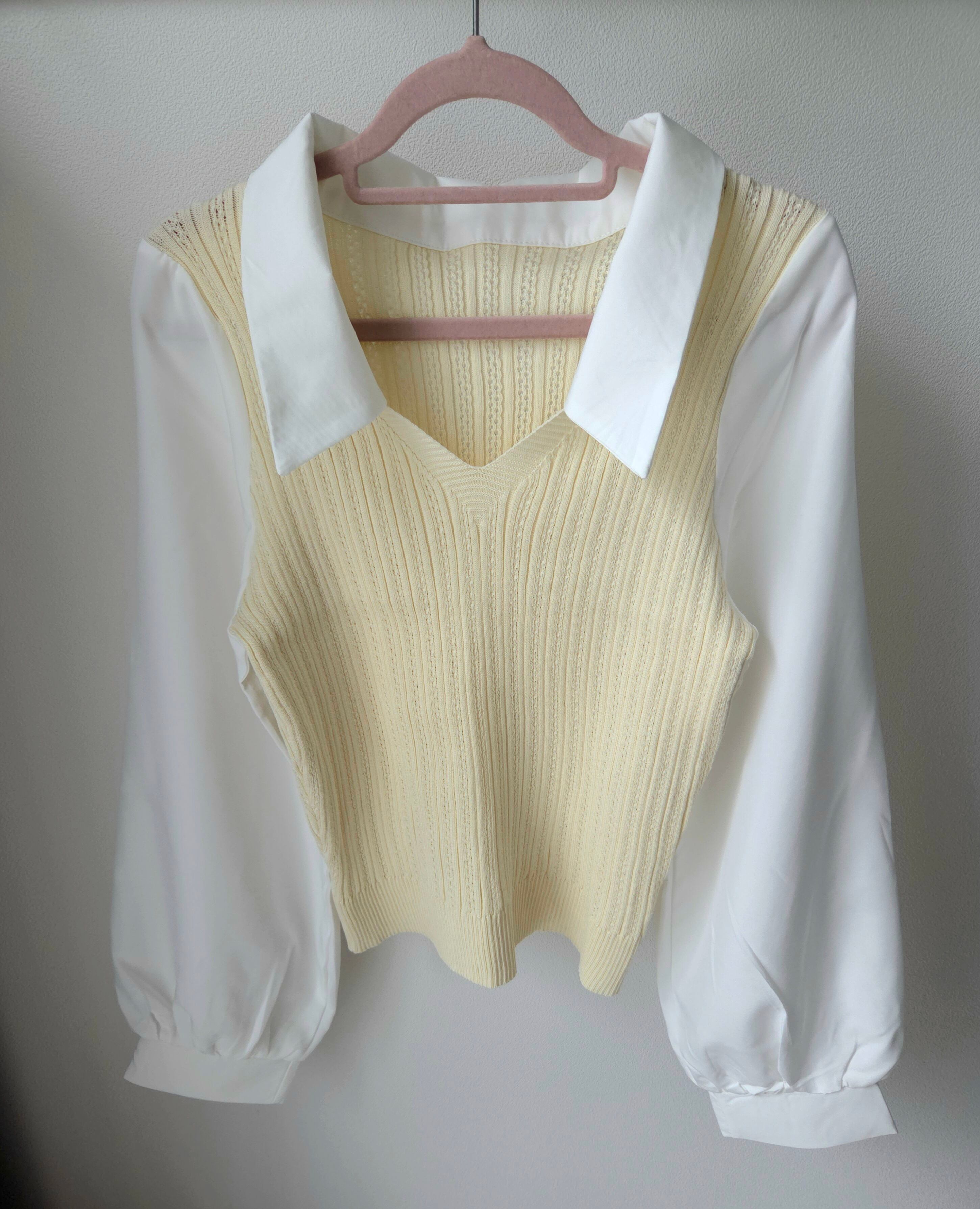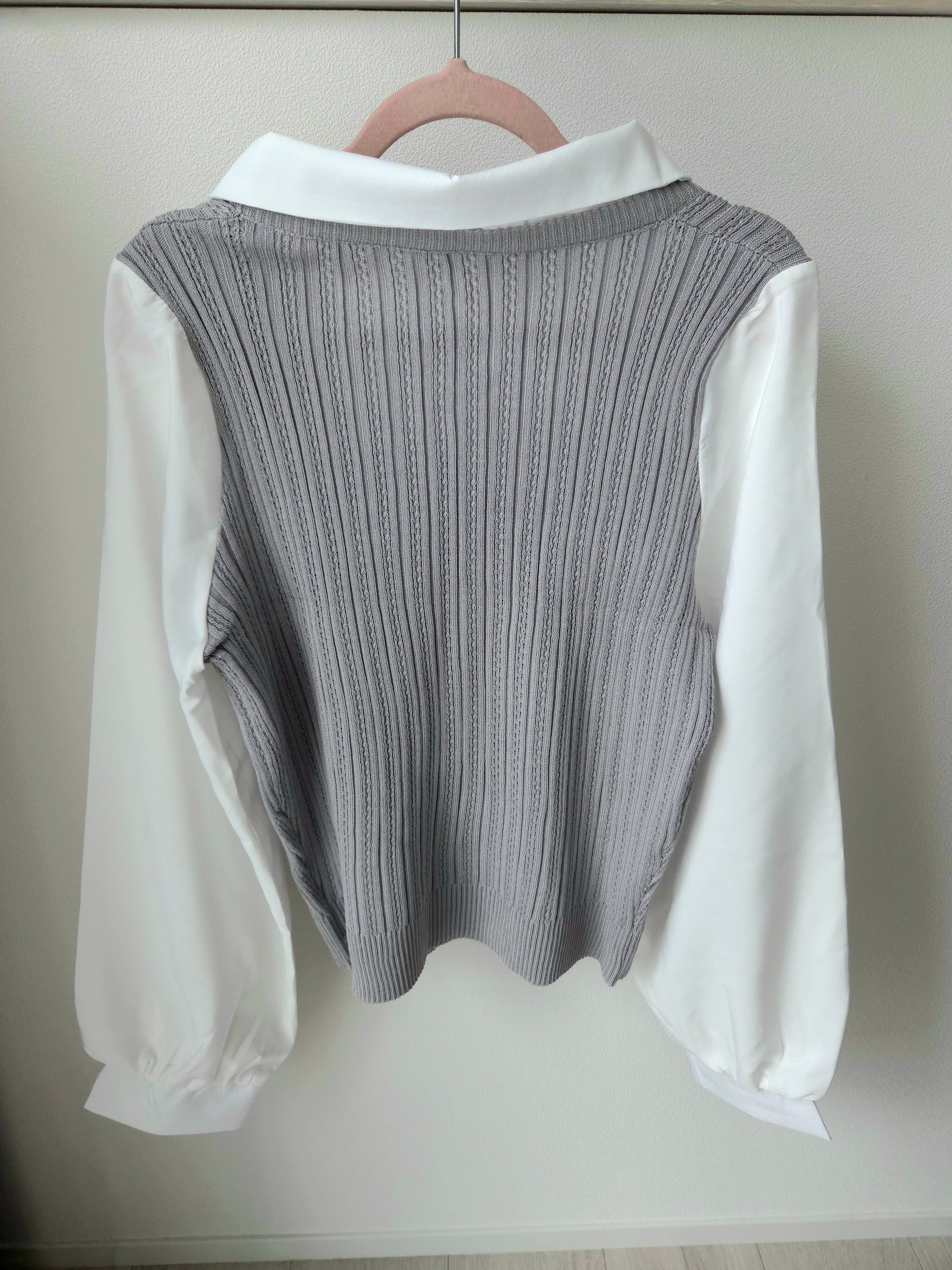 <軽やかな素材感と重ね着風デザインが特徴のシャツニット♡心地よい着心地で、コーディネートに新たなアクセントを加えるのにぴったりのアイテム!ナチュラルな印象を与え、スタイリングの幅を広げてくれます✨>