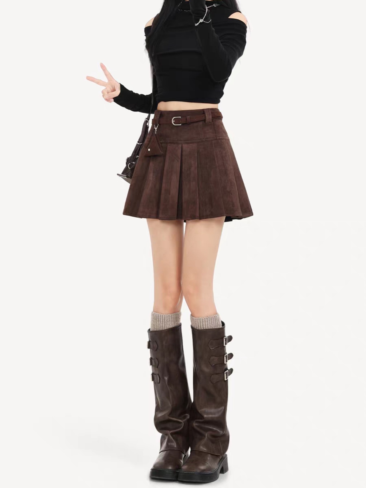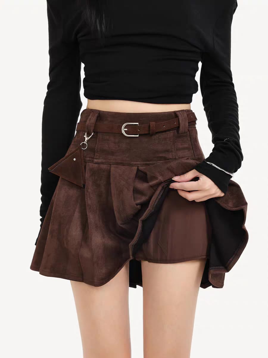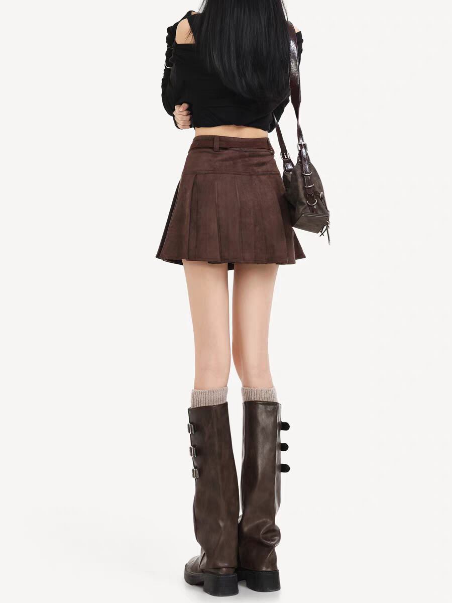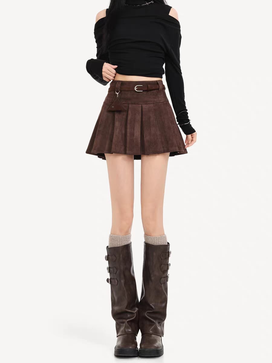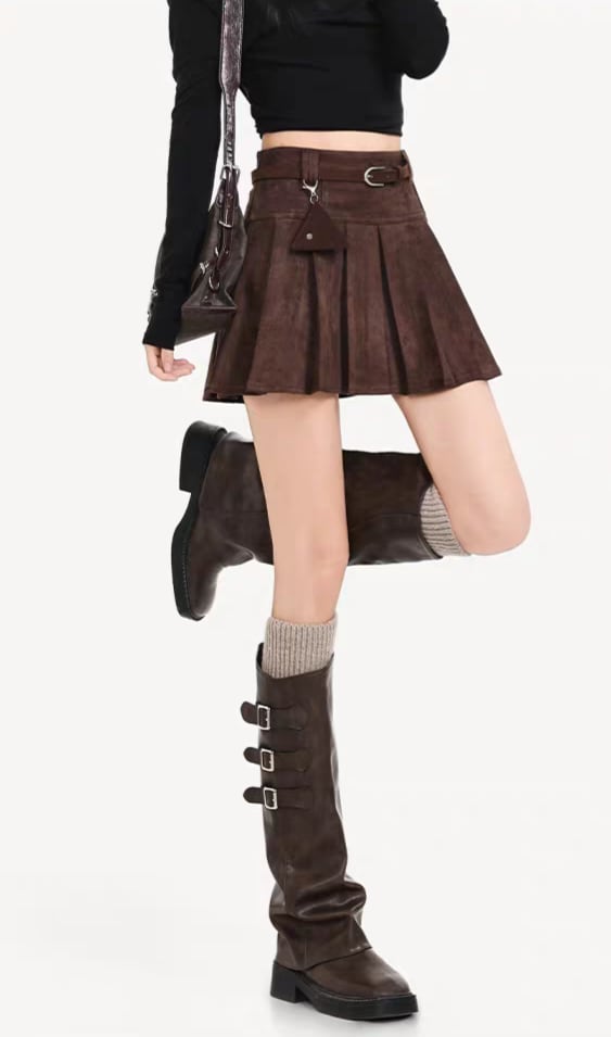 «チャーム付きスエードプリーツスカートで楽しむ上品でトレンド感溢れるスタイル»